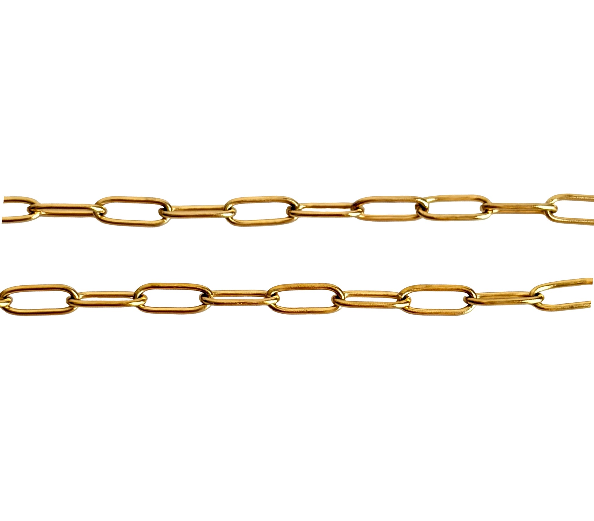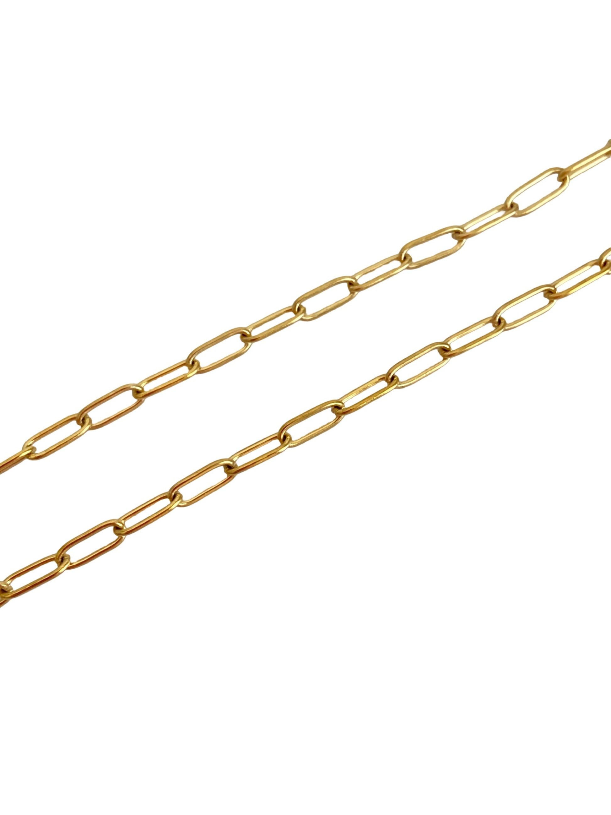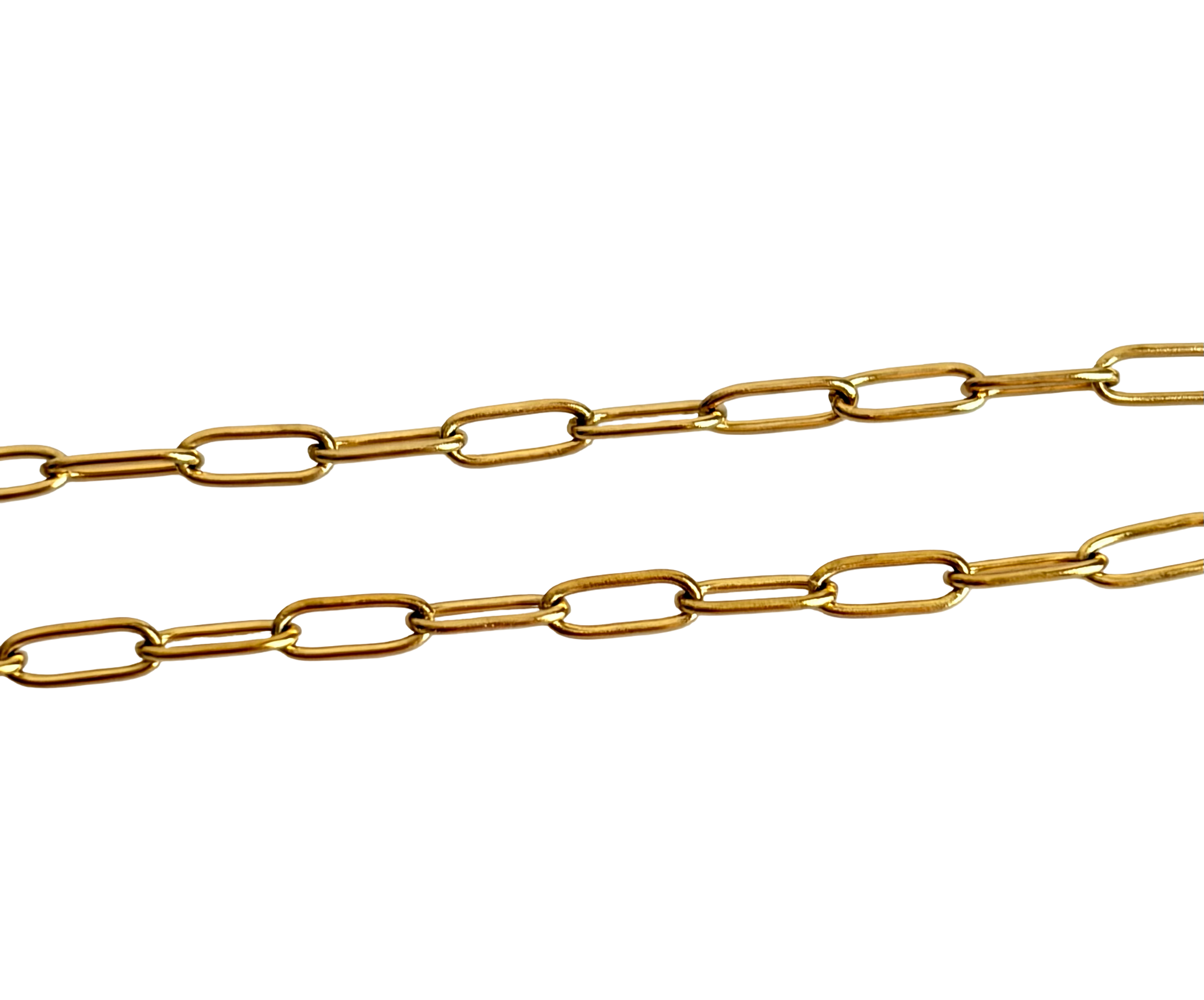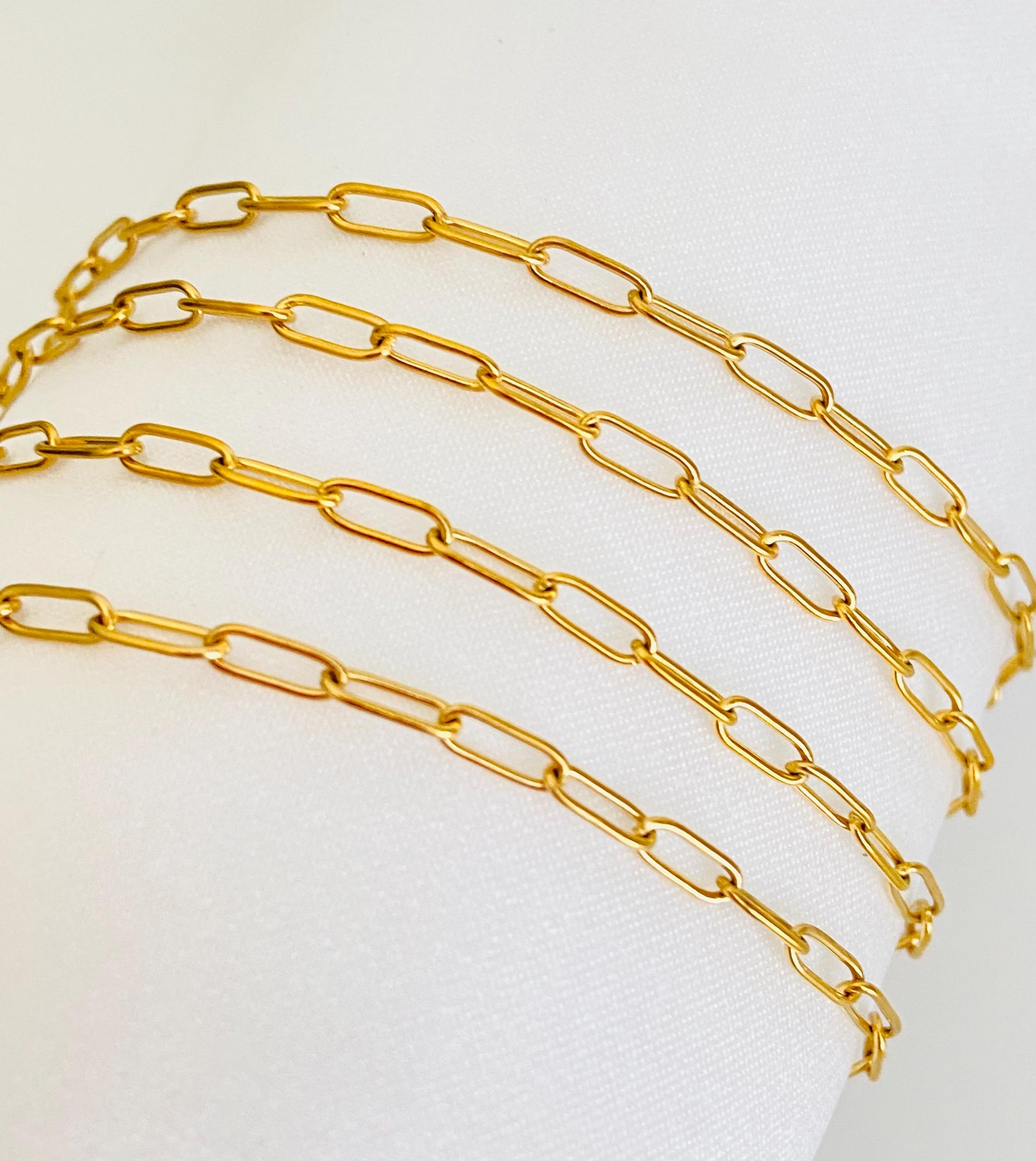 18K gold over stainless steel flat small paperclip chain for DIY jewelry, necklaces, bracelets, and layered designs. Durable, tarnish-resistant, and versatile, it’s perfect for adding charms, pendants, or personalized elements. Ideal for jewelry makers, hobbyists, and small business creators looking to craft custom, stylish, and gift-ready pieces.