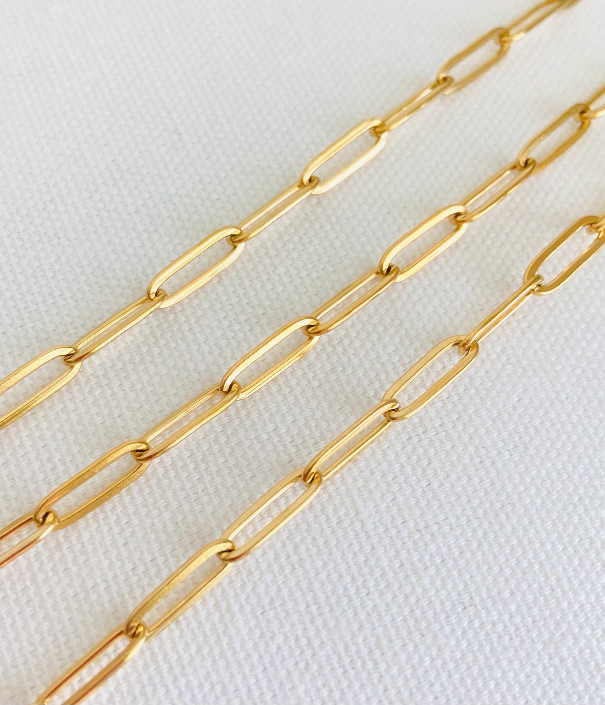 This 4mm × 12mm gold over stainless steel flat paperclip chain features elongated oval links with a polished gold finish, perfect for trendy necklaces, bracelets, and DIY jewelry projects. Durable, rust-resistant, and stylish, it’s ideal for modern jewelry designs and everyday wear.