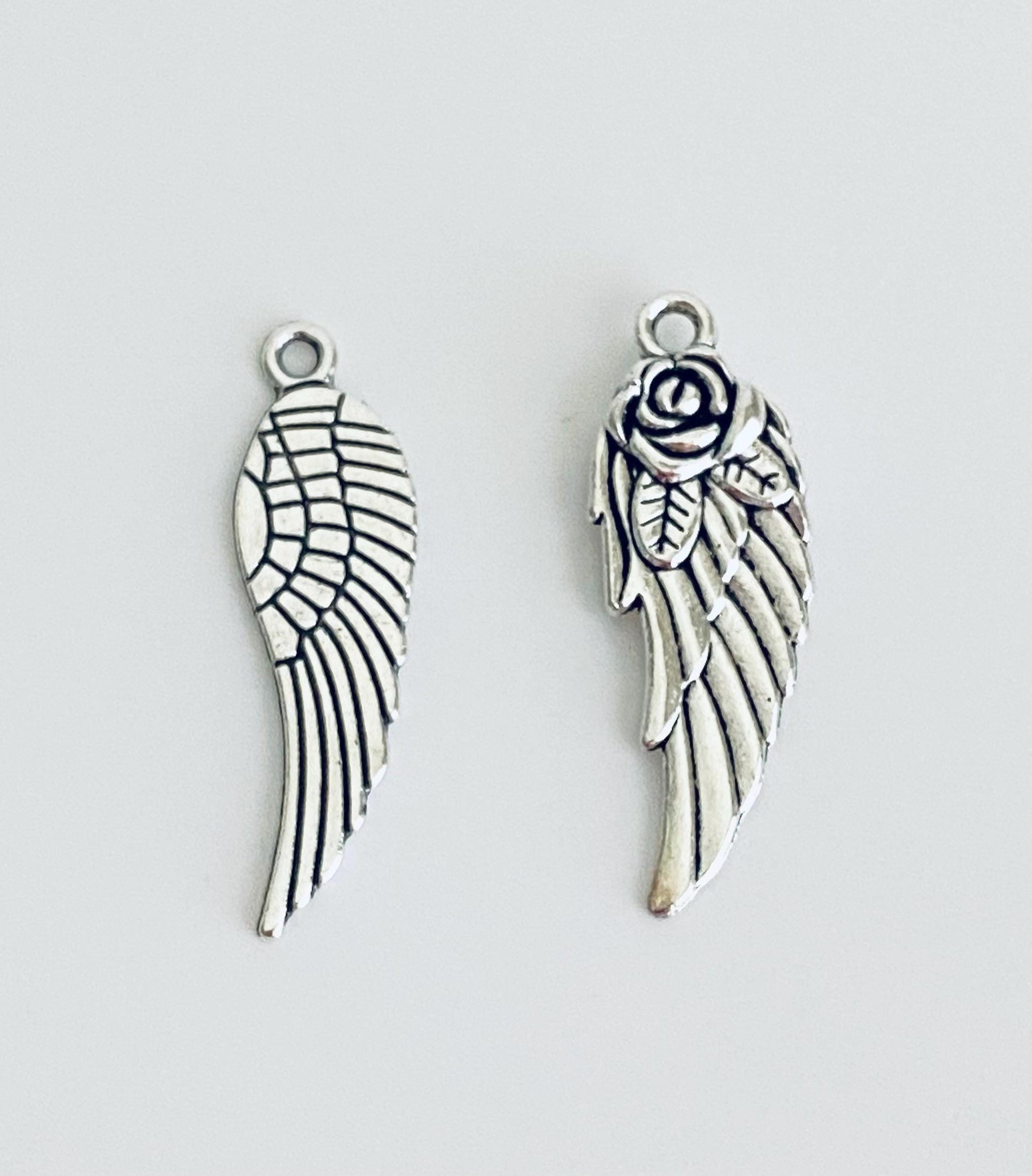 Add a touch of inspiration and elegance to your jewelry designs with this base metal angel wing charm. Crafted from durable base metal, this charm features intricate wing detailing, perfect for DIY necklaces, bracelets, keychains, or other craft projects.