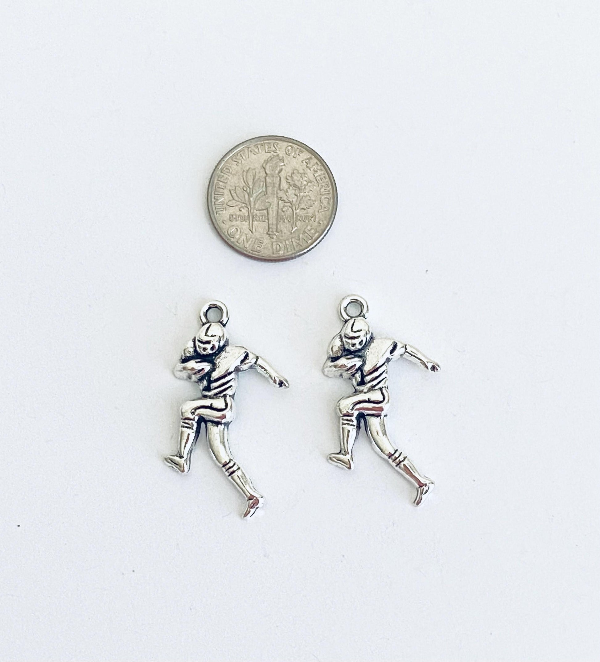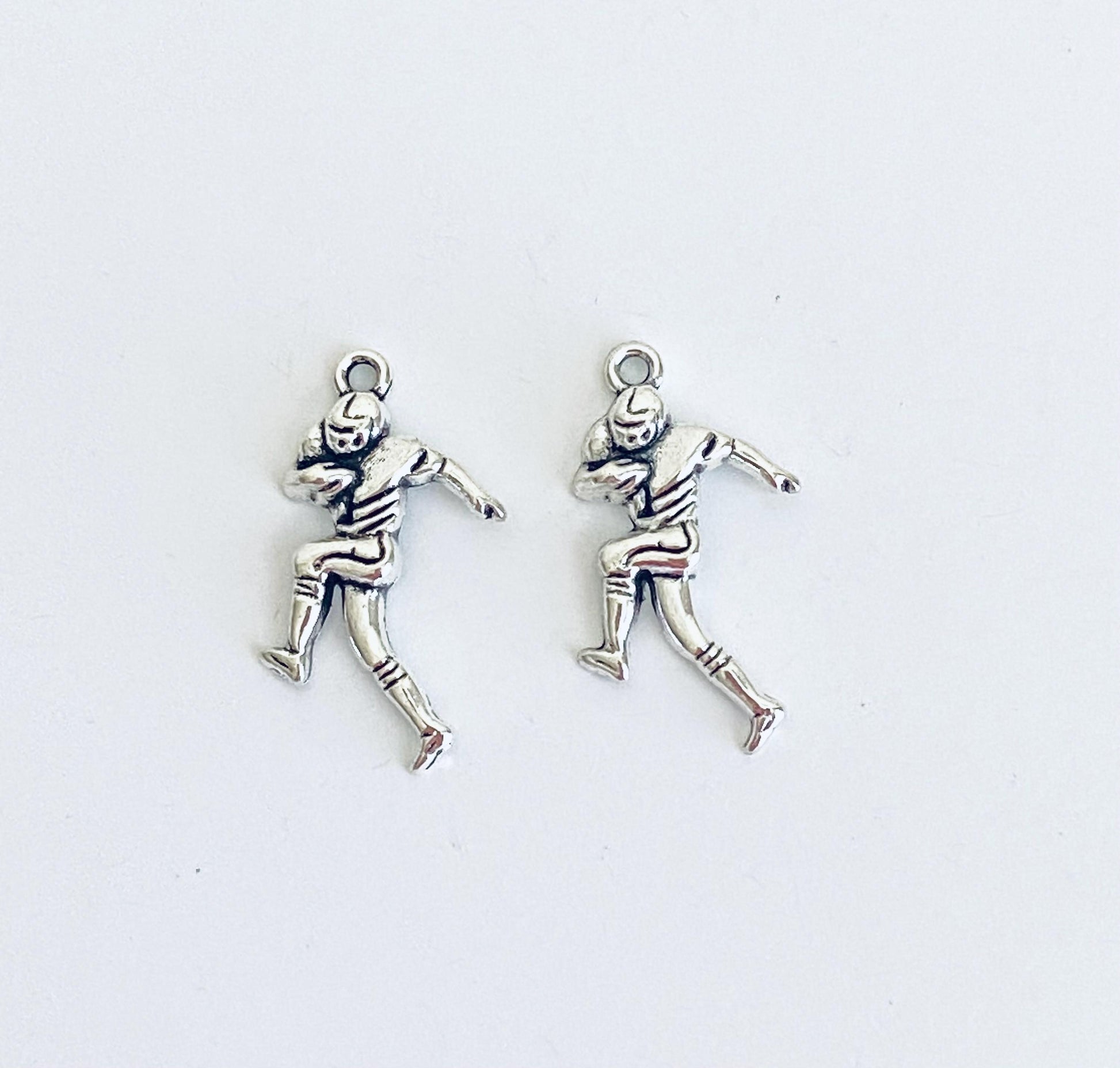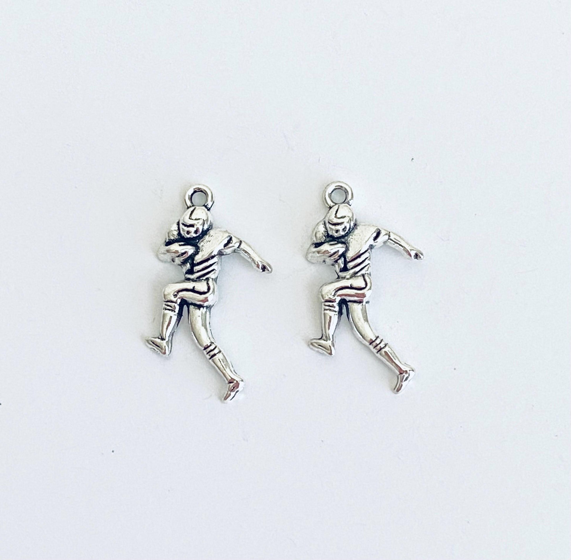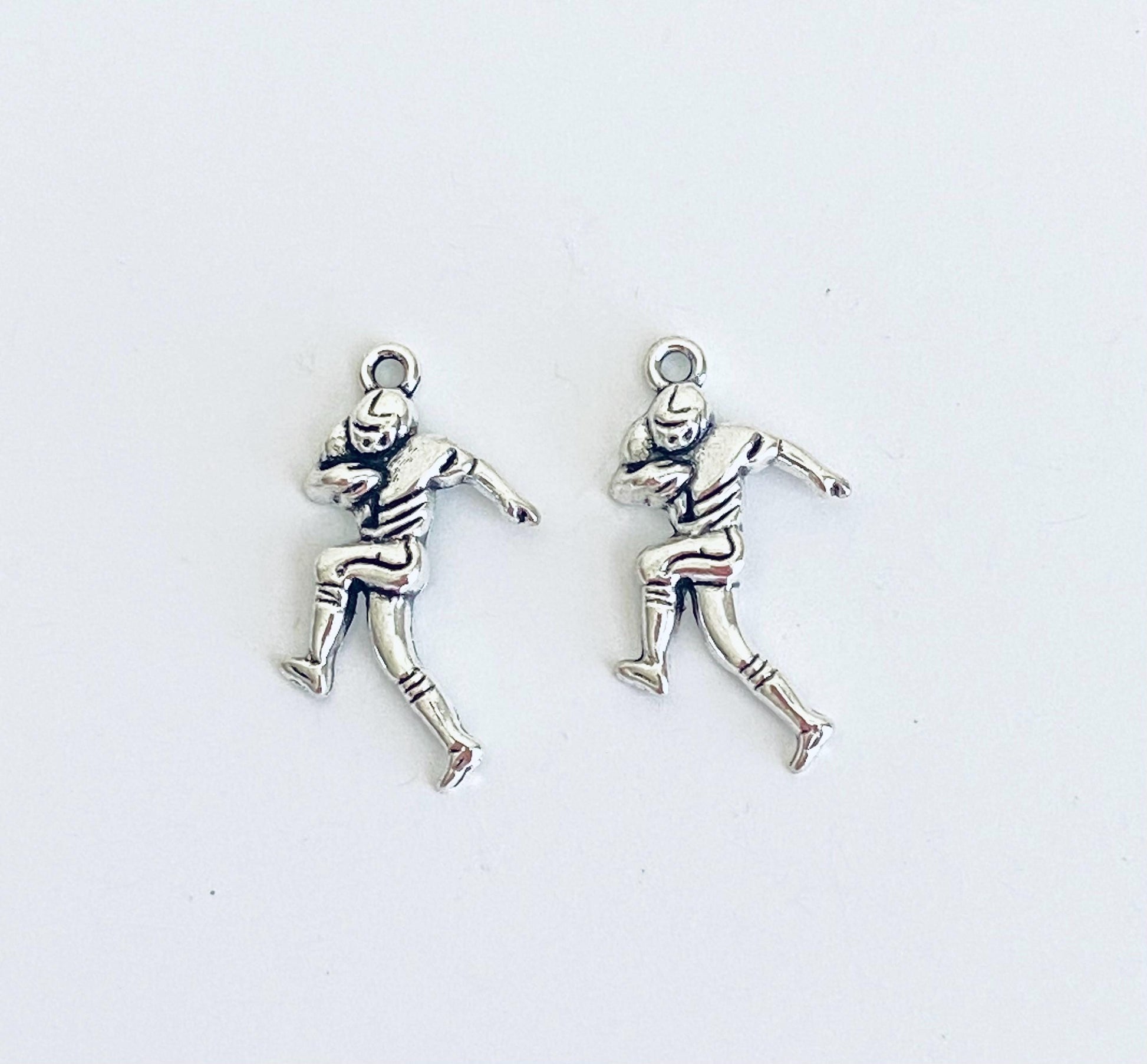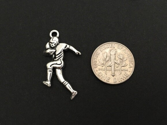Celebrate the love of football with this base metal football player charm. Featuring a dynamic sports design, this charm is perfect for bracelets, necklaces, keychains, and DIY jewelry projects. A great choice for athletes, fans, coaches, and sports-themed accessories.