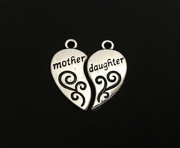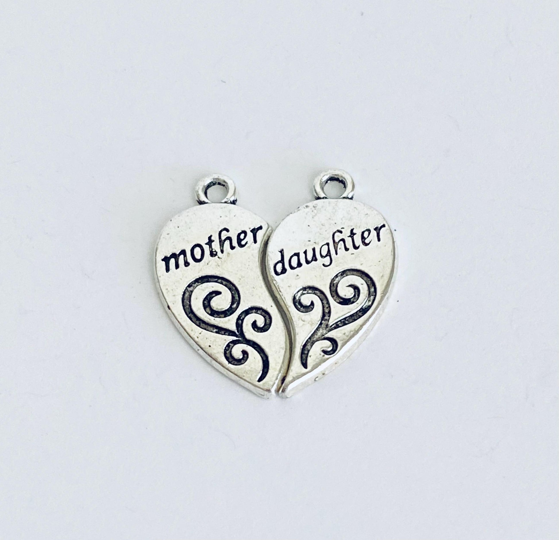 Celebrate the special bond between mother and daughter with this base metal mother and daughter broken heart charm. Designed as a split heart that symbolizes love and connection, this charm is perfect for bracelets, necklaces, keychains, and DIY jewelry projects.