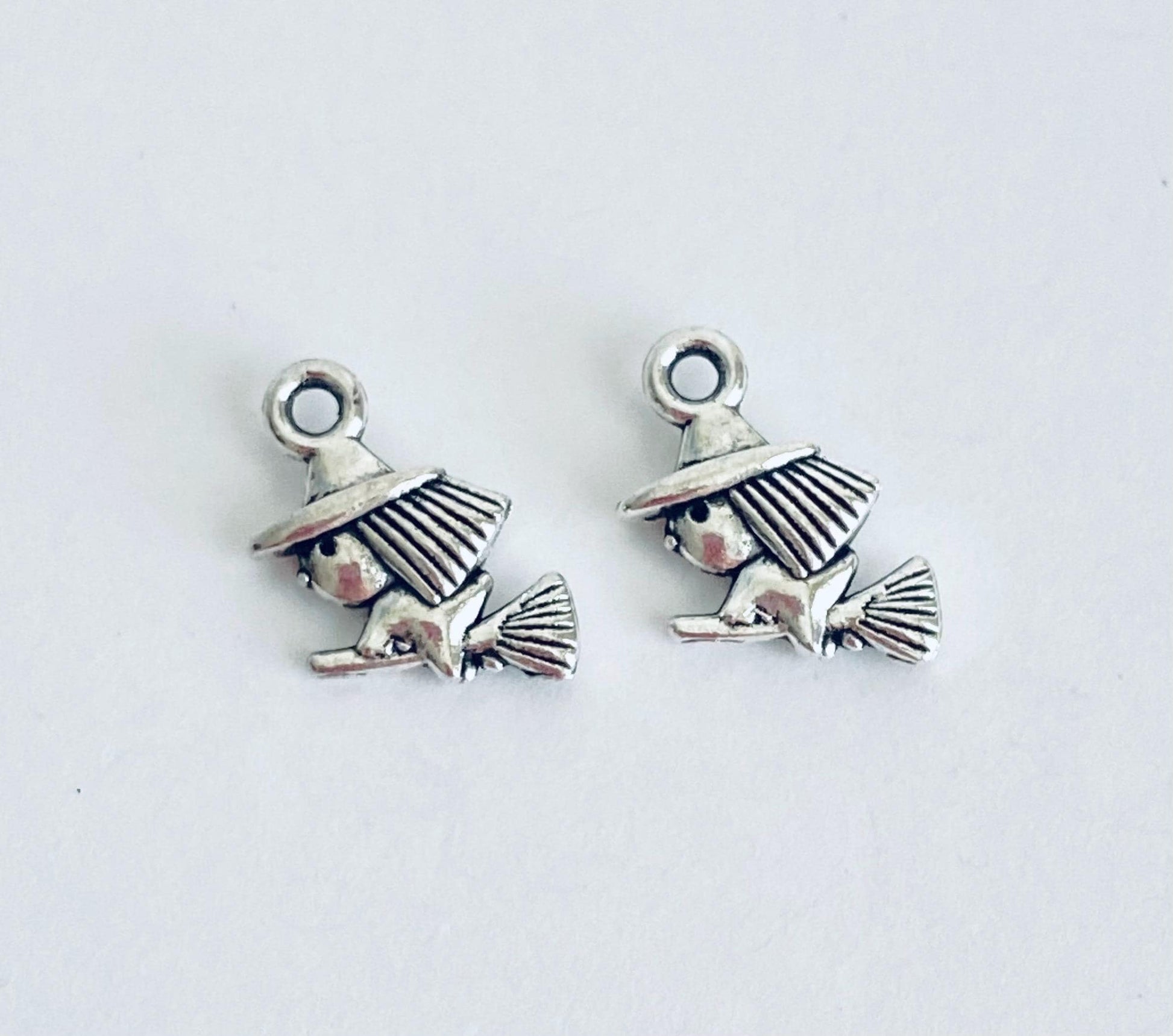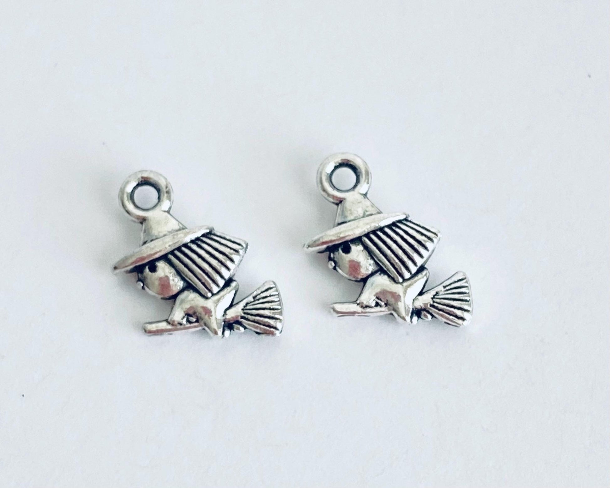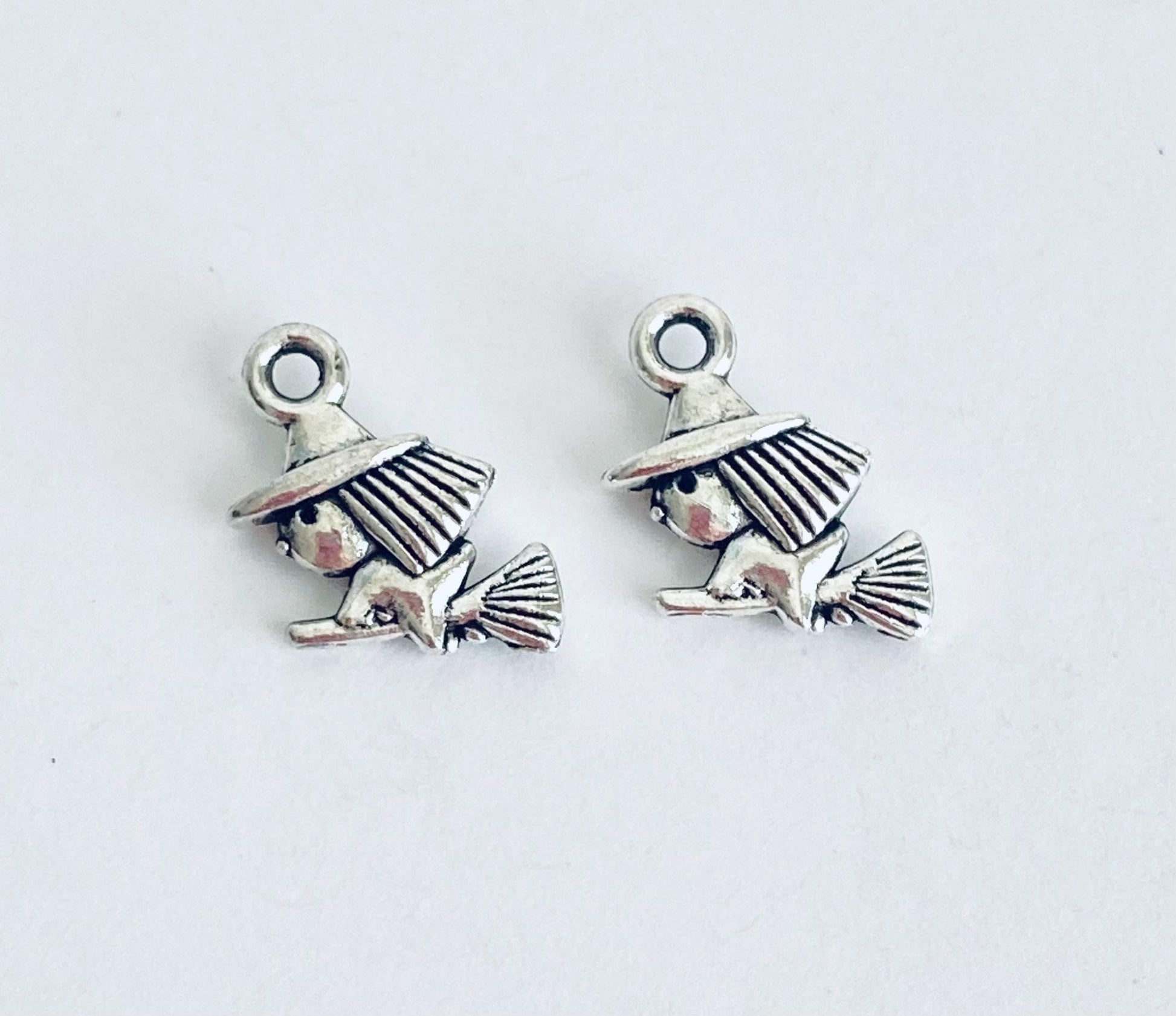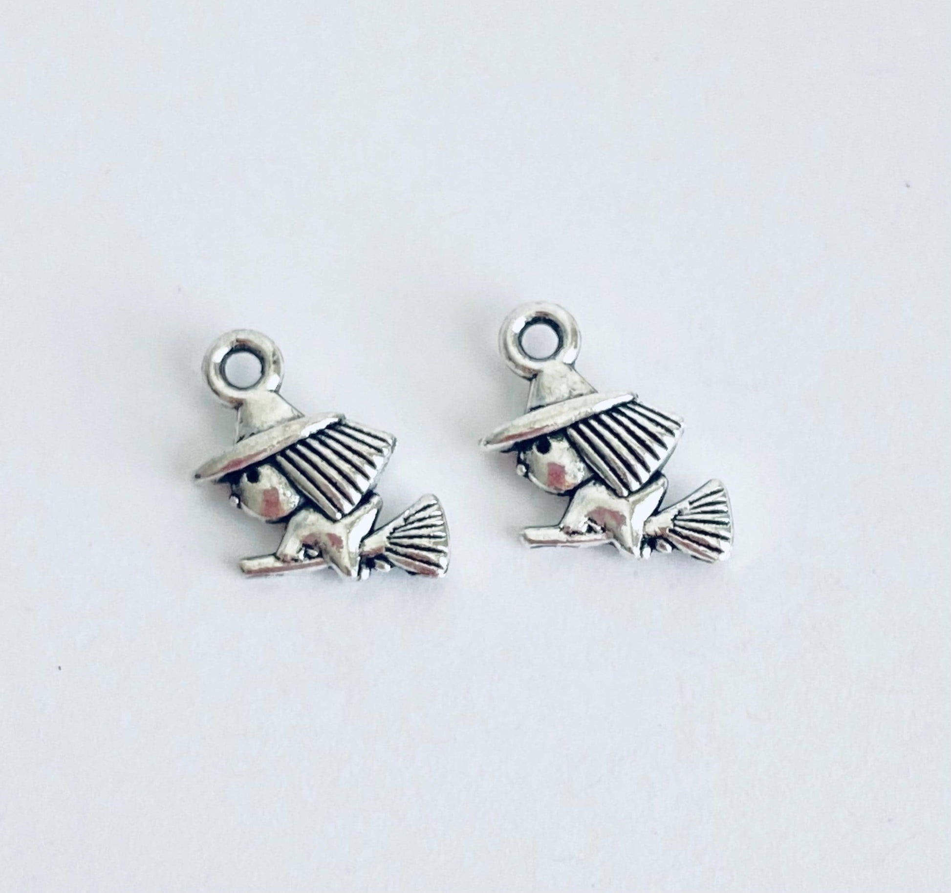 Add a magical touch to your jewelry designs with this base metal small witch charm. This miniature charm is perfect for bracelets, necklaces, earrings, keychains, and DIY jewelry projects.