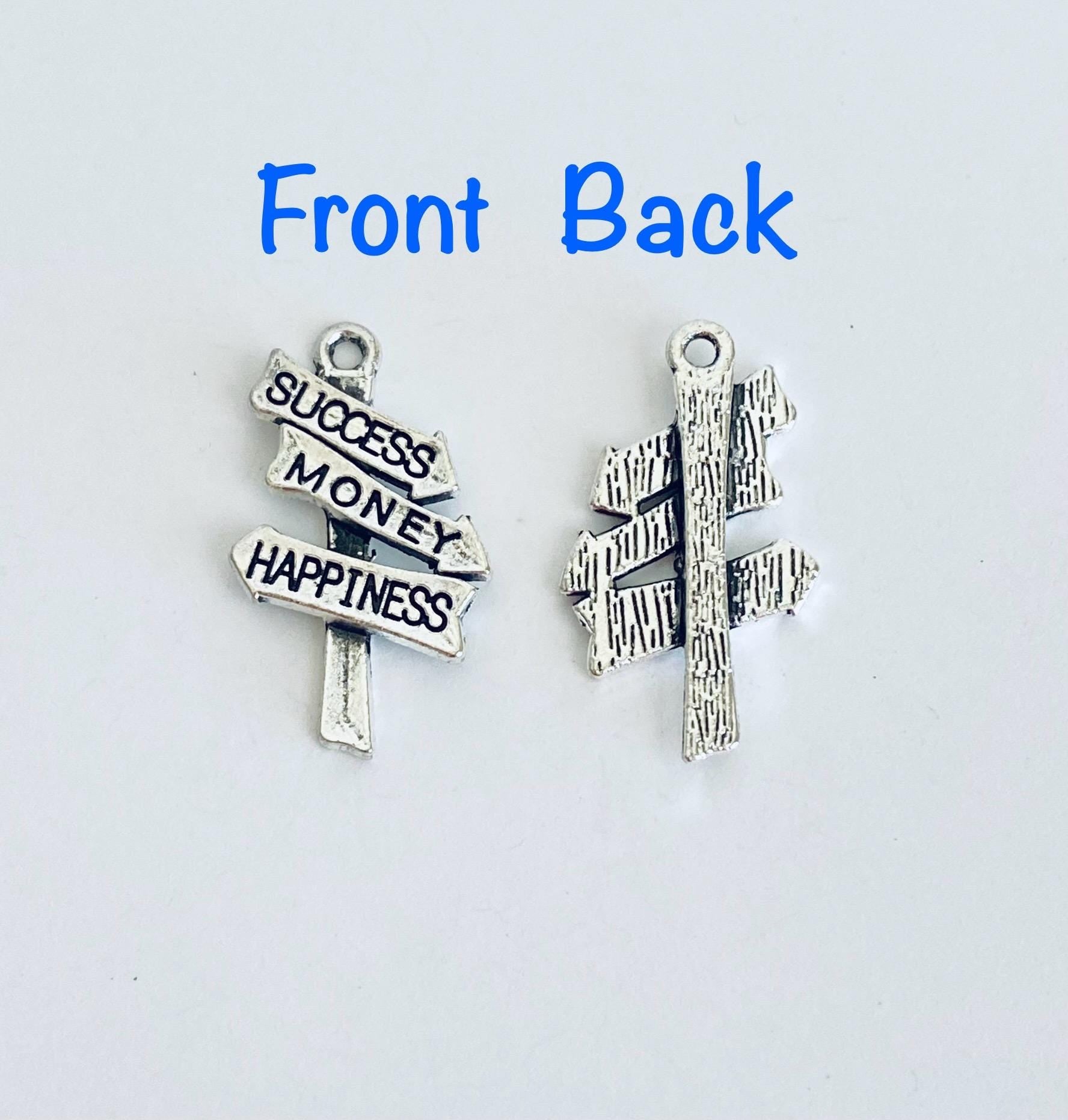 This base metal success, money, happiness charm symbolizes achievement and motivation, perfect for inspirational jewelry designs. Ideal for necklaces, bracelets, earrings, and DIY charm projects.