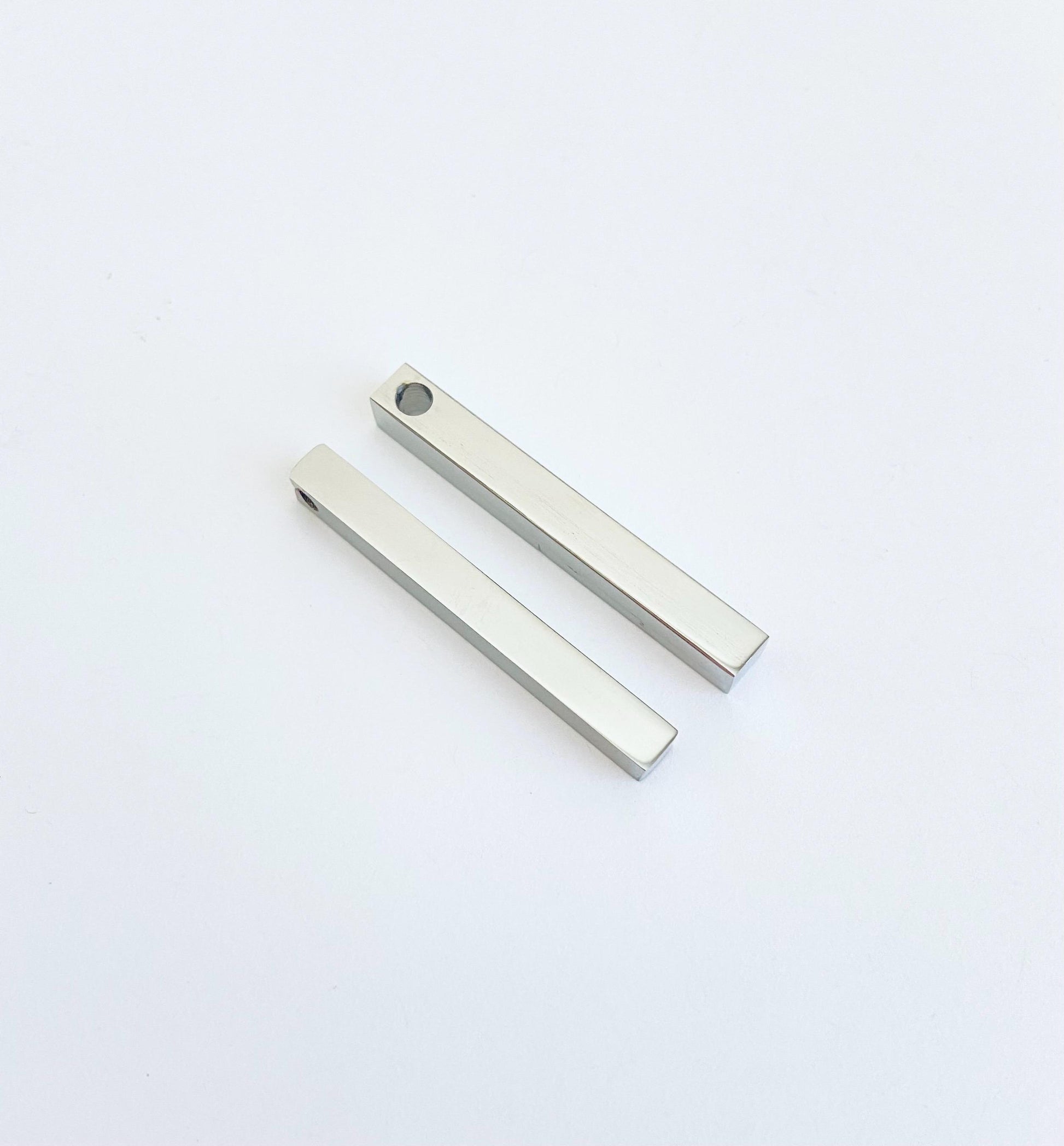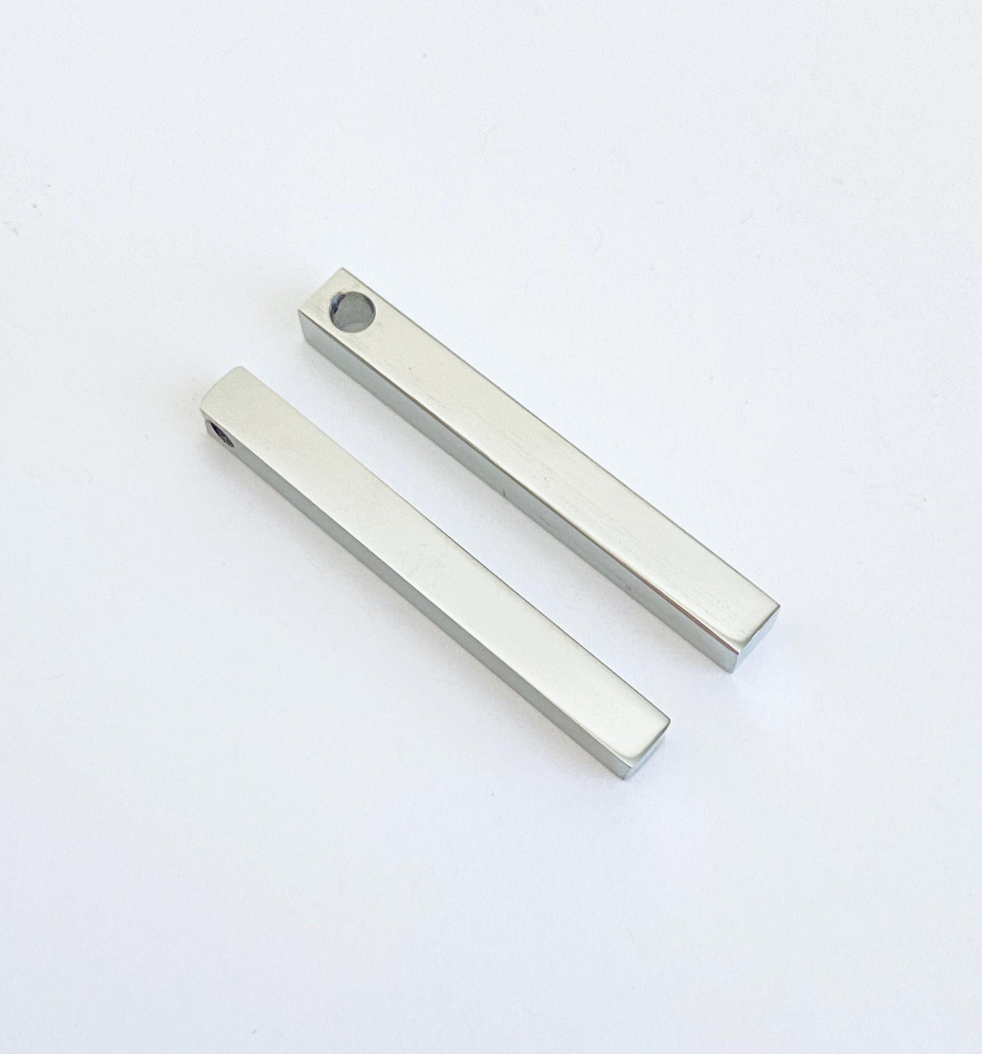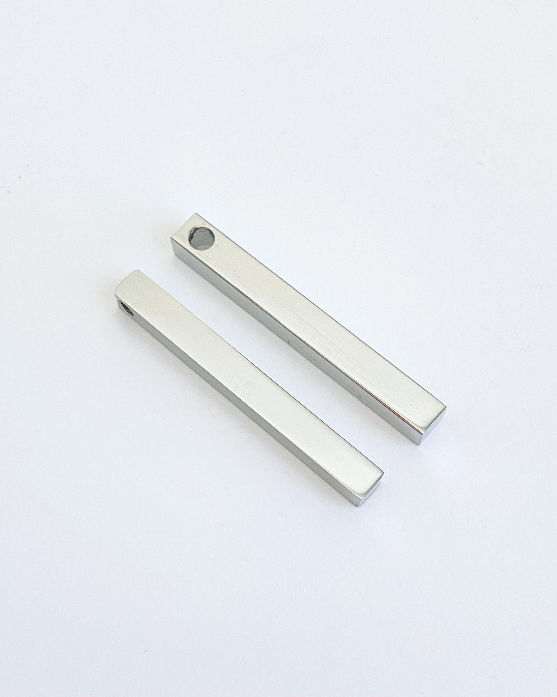 Create modern and personalized jewelry with this long cube stainless steel bar. Featuring a sleek square-edged design and smooth polished surface, this bar is perfect for engraving names, initials, dates, coordinates, or meaningful messages.
