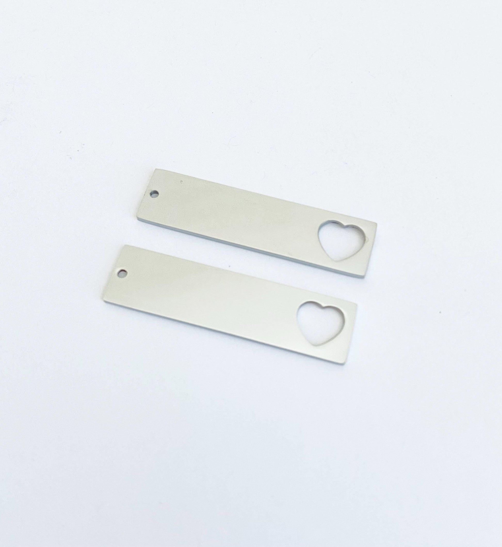 Engravable stainless steel long blank with heart cutout, ideal for stamping, laser engraving, and DIY jewelry. A sleek, durable base for personalized pendants and custom designs.